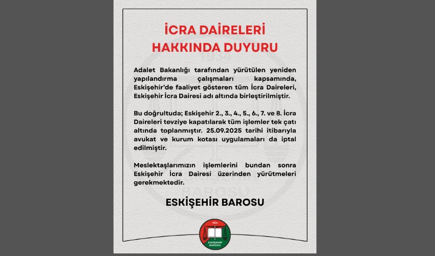 Eskişehir 3. İcra Dairesinin Eskişehir İcra Dairesi ile Birleştirilmesi hk. - 09.10.2025